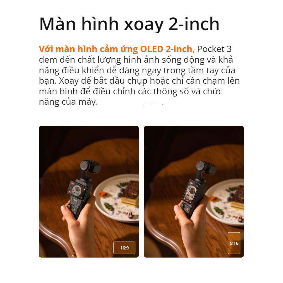 DJI Osmo Pocket 3 là dòng máy quay nhỏ gọn, di động có cảm biến CMOS 1 inch, mang đến hình ảnh sắc nét. Với màn hình cảm ứng 2 inch có khả năng xoay ngang và dọc, có thể lấy nét chính xác trên toàn khung hình và quay video 4K/120fps, Pocket 3 đáp ứng mọi nhu cầu của một chiếc camera hành động. Ngoài ra, ổn định cơ học 3 trục, đảm bảo hình ảnh luôn mượt mà trong mọi tình huống: